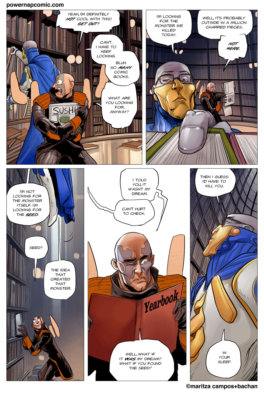 (maritza says) Welcome! This is Power Nap, our online graphic novel. It's a science fiction story heavily oriented towards action and humor. Remember! You can follow the updates using the rss, or follow me on Twitter. I always announce updates and news on twitter, and my username is @maritzac if you want to see the announcements as the comic updates. In addition, you're welcome to join the Power Nap fan page in Facebook |