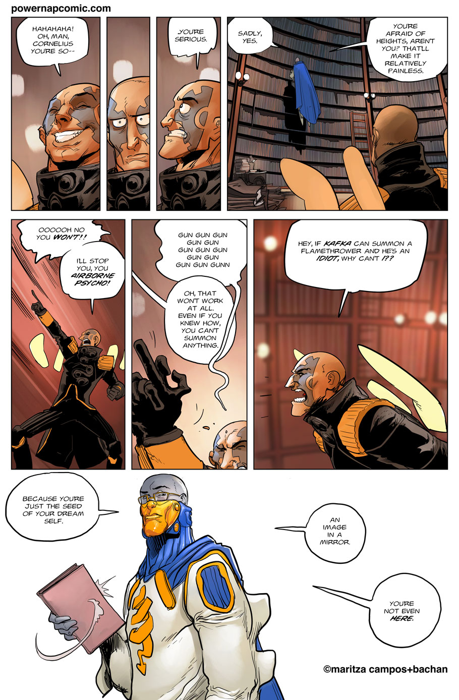(maritza says) Welcome! This is Power Nap, our online graphic novel. It's a science fiction story heavily oriented towards action and humor. Remember! You can follow the updates using the rss, or follow me on Twitter. I always announce updates and news on twitter, and my username is @maritzac if you want to see the announcements as the comic updates. In addition, you're welcome to join the Power Nap fan page in Facebook |