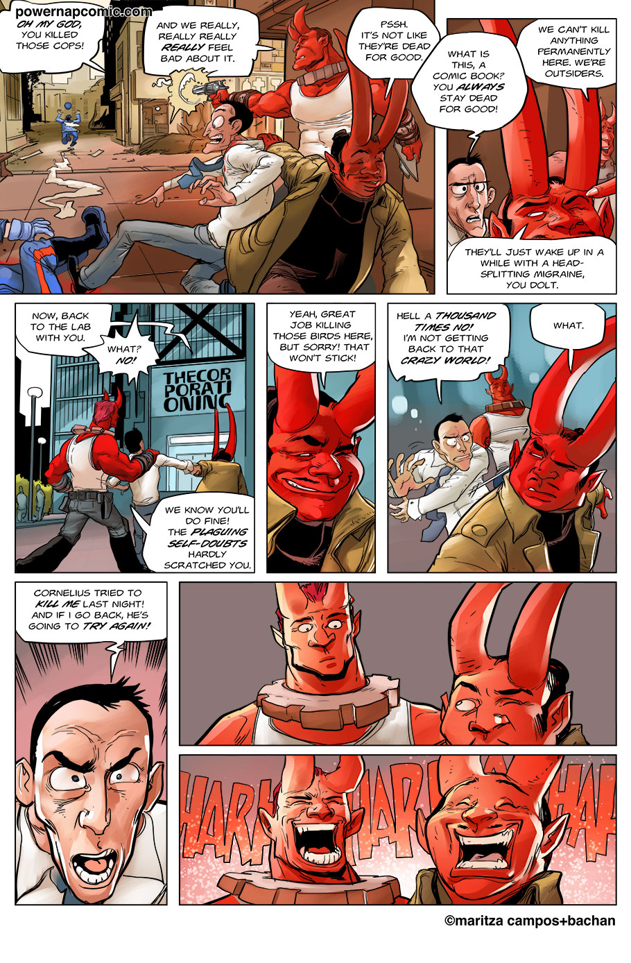 (maritza says) Welcome! This is Power Nap, our online graphic novel. It's a science fiction story heavily oriented towards action and humor. Remember! You can follow the updates using the rss, or follow me on Twitter. I always announce updates and news on twitter, and my username is @maritzac if you want to see the announcements as the comic updates. In addition, you're welcome to join the Power Nap fan page in Facebook |