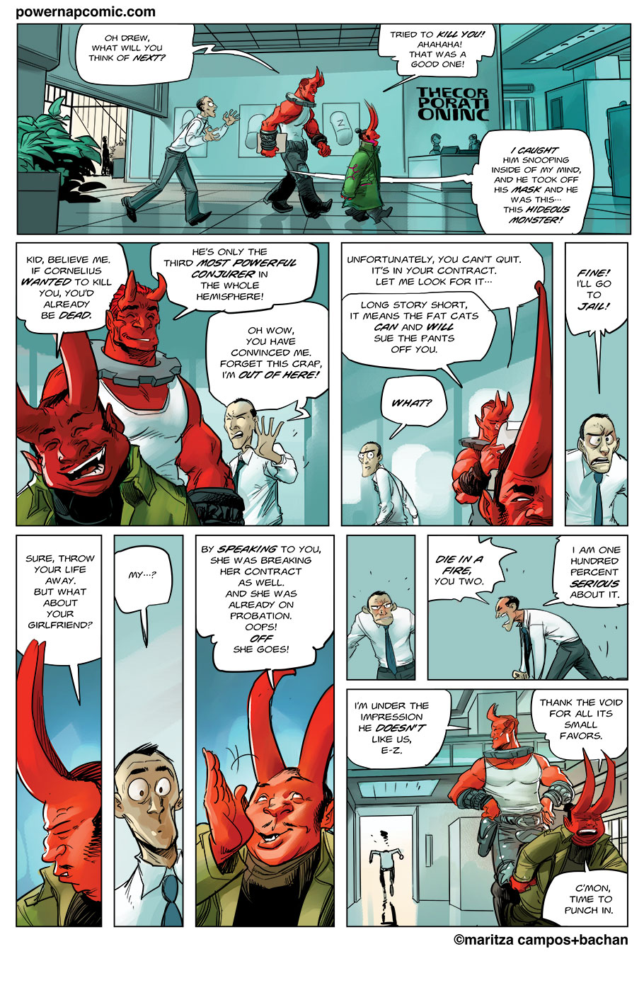(maritza says) Welcome! This is Power Nap, our online graphic novel. It's a science fiction story heavily oriented towards action and humor. Remember! You can follow the updates using the rss, or follow me on Twitter. I always announce updates and news on twitter, and my username is @maritzac if you want to see the announcements as the comic updates. In addition, you're welcome to join the Power Nap fan page in Facebook |
