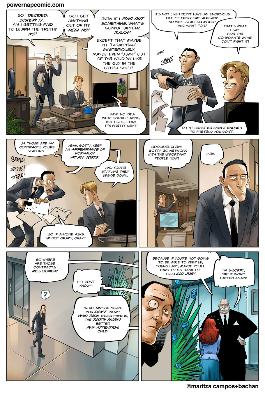 (maritza says) Welcome! This is Power Nap, our online graphic novel. It's a science fiction story heavily oriented towards action and humor. Remember! You can follow the updates using the rss, or follow me on Twitter. I always announce updates and news on twitter, and my username is @maritzac if you want to see the announcements as the comic updates. In addition, you're welcome to join the Power Nap fan page in Facebook |