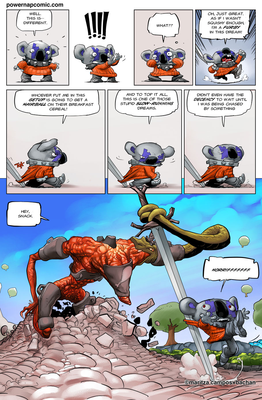 (maritza says) Welcome! This is Power Nap, our online graphic novel. It's a science fiction story heavily oriented towards action and humor. Remember! You can follow the updates using the rss, or follow me on Twitter. I always announce updates and news on twitter, and my username is @maritzac if you want to see the announcements as the comic updates. In addition, you're welcome to join the Power Nap fan page in Facebook |