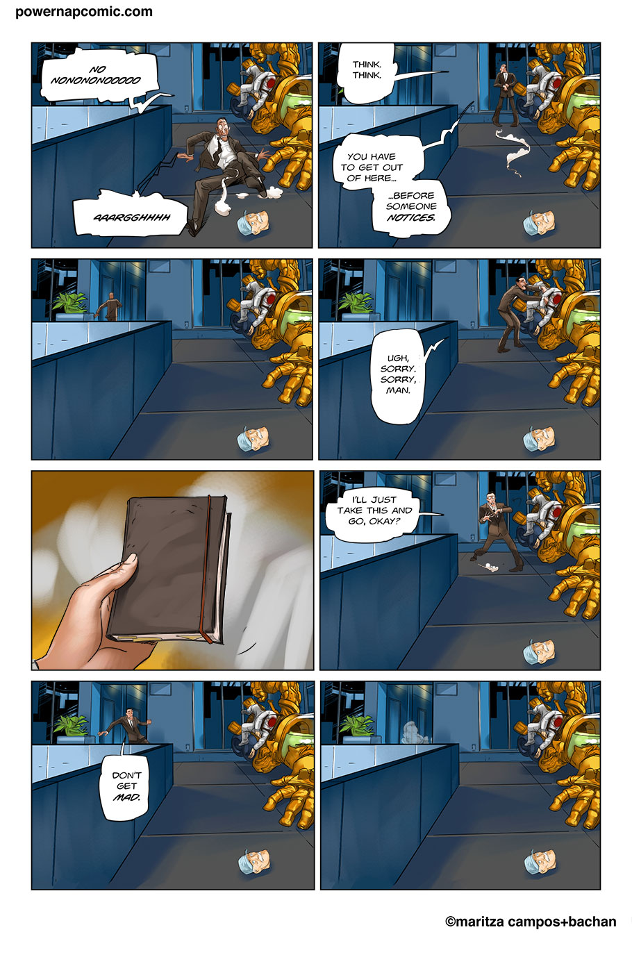 (maritza says) Welcome! This is Power Nap, our online graphic novel. It's a science fiction story heavily oriented towards action and humor. Remember! You can follow the updates using the rss, or follow me on Twitter. I always announce updates and news on twitter, and my username is @maritzac if you want to see the announcements as the comic updates. In addition, you're welcome to join the Power Nap fan page in Facebook |