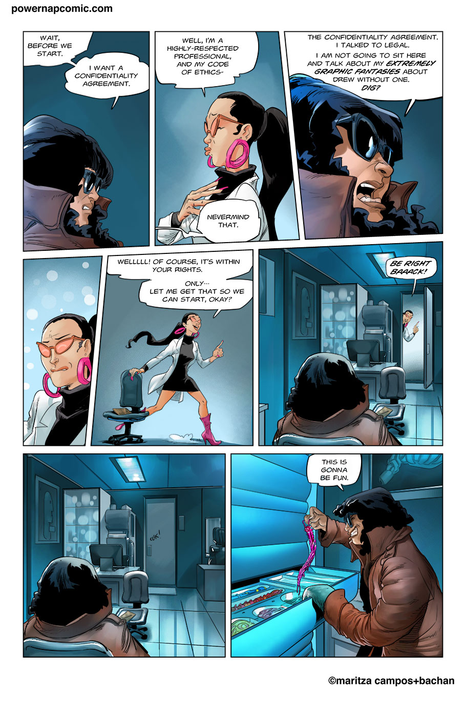 (maritza says) Welcome!  This is Power Nap, our online graphic novel. It's a science fiction story heavily oriented towards action and humor.   Remember! You can follow the updates using the rss, or follow me on Twitter. I always announce updates and news on twitter, and my username is @maritzac if you want to see the announcements as the comic updates. In addition, you're welcome to join the Power Nap fan page in Facebook |