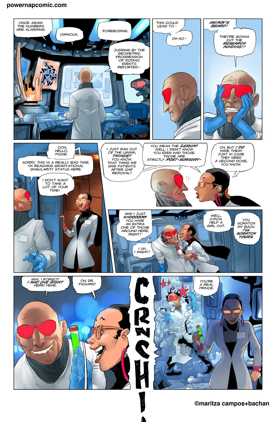 (maritza says) Welcome! This is Power Nap, our online graphic novel. It's a science fiction story heavily oriented towards action and humor. Remember! You can follow the updates using the rss, or follow me on Twitter. I always announce updates and news on twitter, and my username is @maritzac if you want to see the announcements as the comic updates. In addition, you're welcome to join the Power Nap fan page in Facebook |