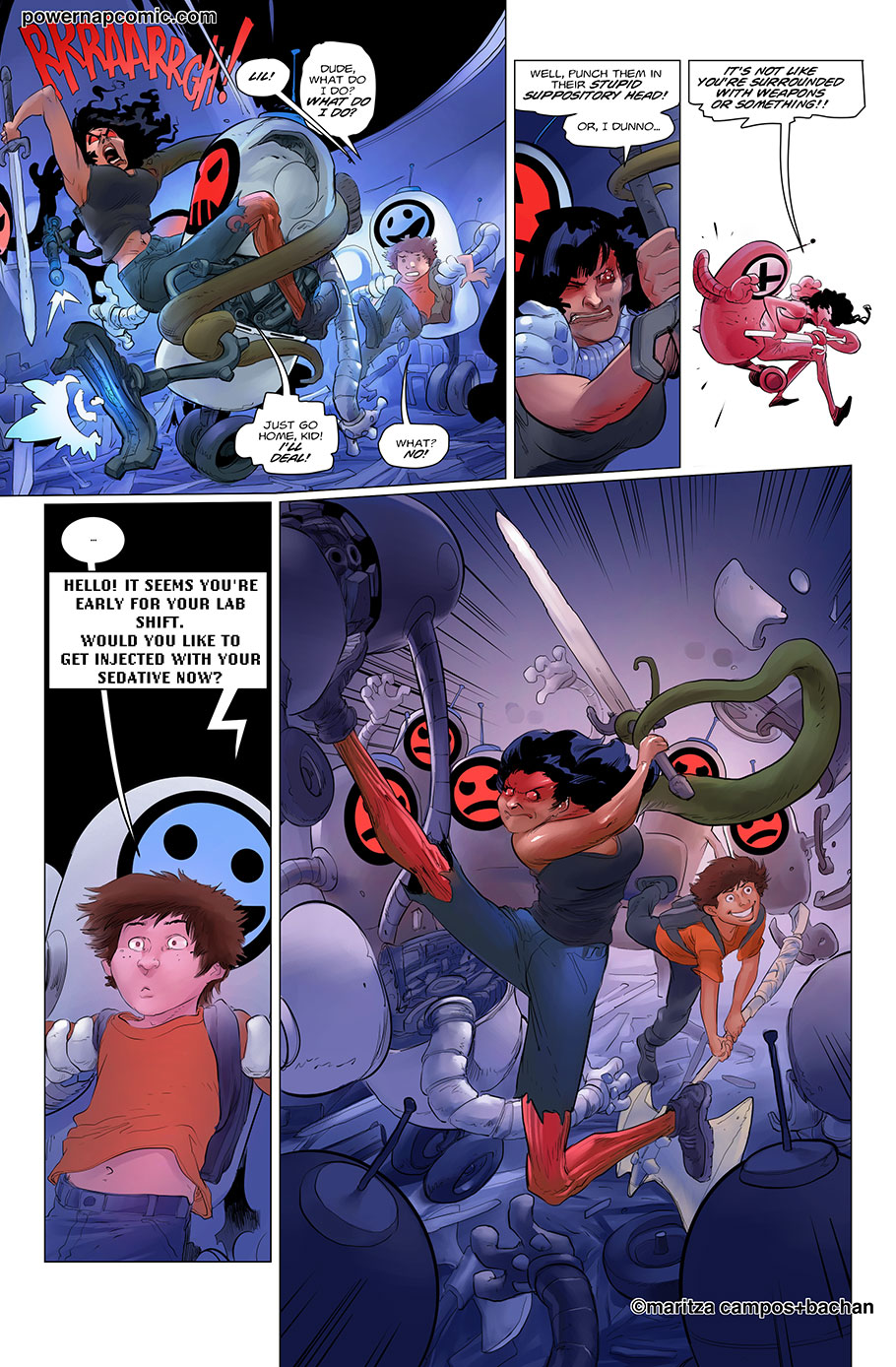 (maritza says) Welcome! This is Power Nap, our online graphic novel. It's a science fiction story heavily oriented towards action and humor. Remember! You can follow the updates using the rss, or follow me on Twitter. I always announce updates and news on twitter, and my username is @maritzac if you want to see the announcements as the comic updates. In addition, you're welcome to join the Power Nap fan page in Facebook |